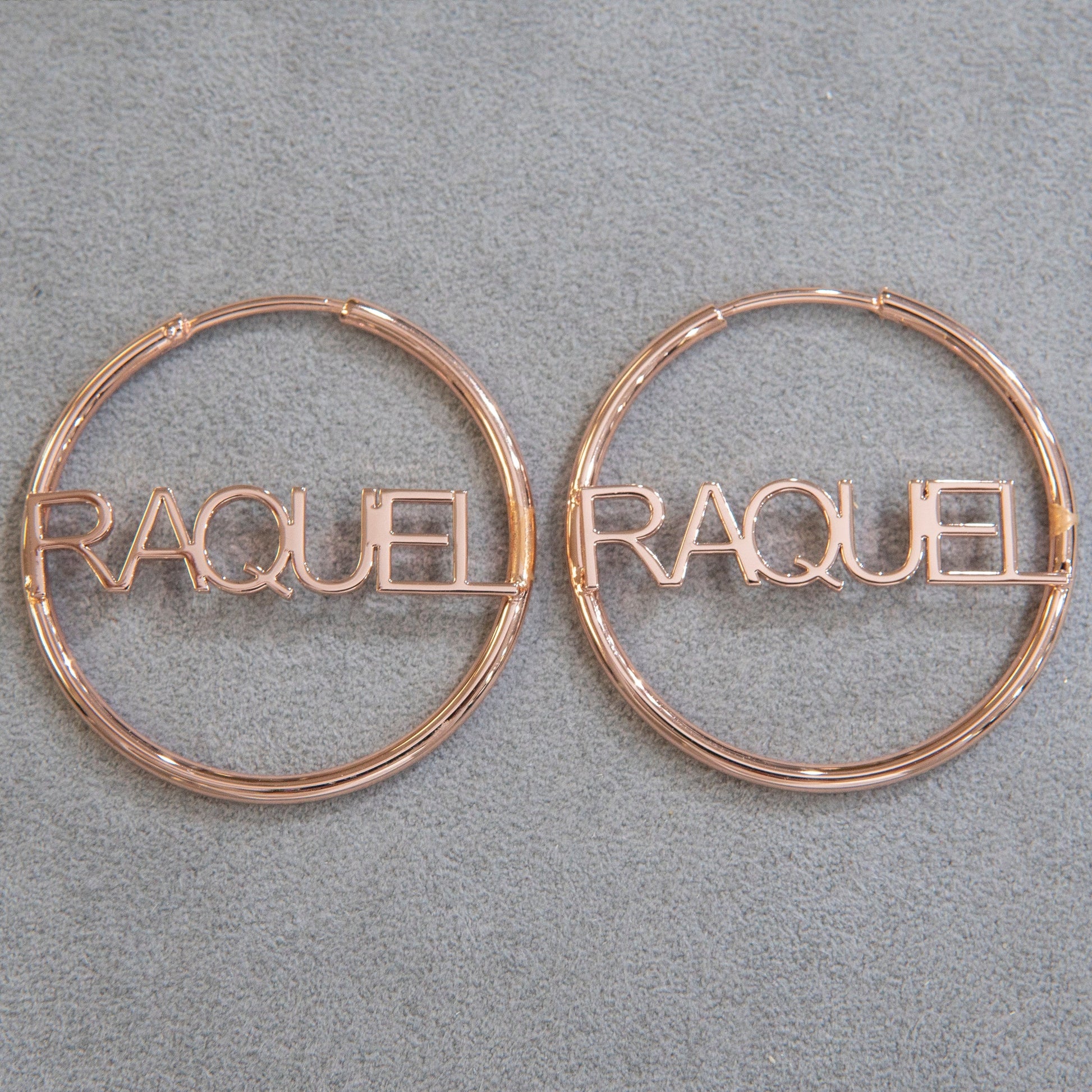 14K Rose Gold Plated Ladies Script Name Plate Hoop Earrings. The diameter of the hoop earring is 1.6 inches. Due to the custom nature of this product, please allow 14-21 business days for completion.