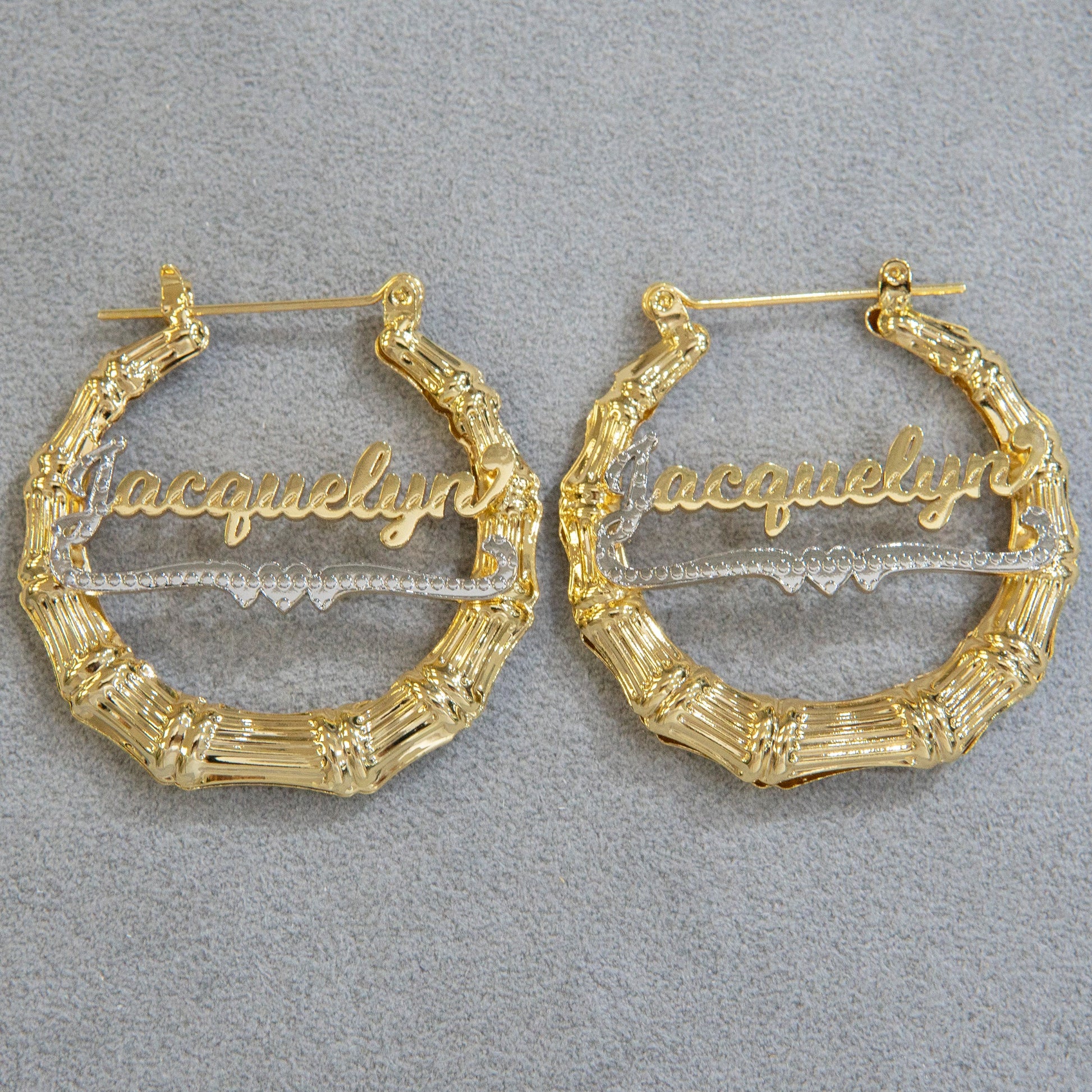 14K Gold Plated Ladies Script Name Plate Hoop Earrings. The diameter of the hoop earring is 1.6 inches. Due to the custom nature of this product, please allow 14-21 business days for completion.
