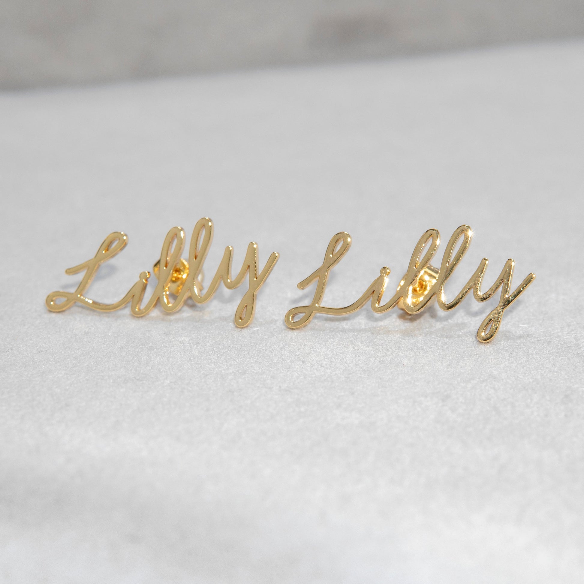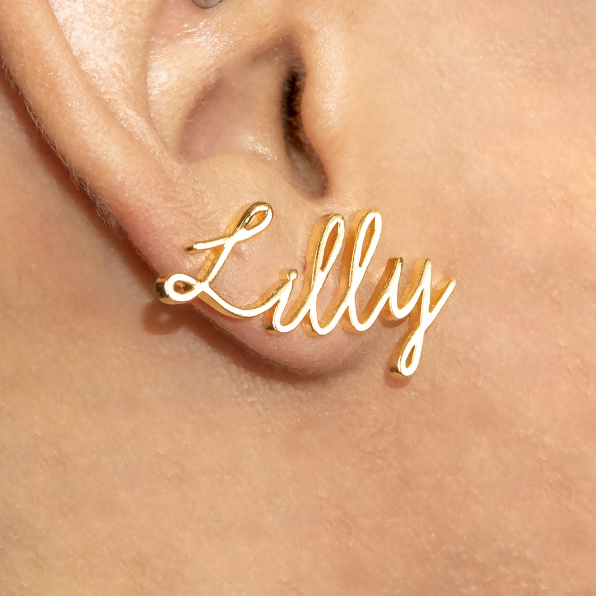 14K Gold Plated Ladies Script Name Plate Earrings. The earring measures 1.2 inches wide and 0.5 inches long. Due to the custom nature of this product, please allow 14-21 business days for completion.