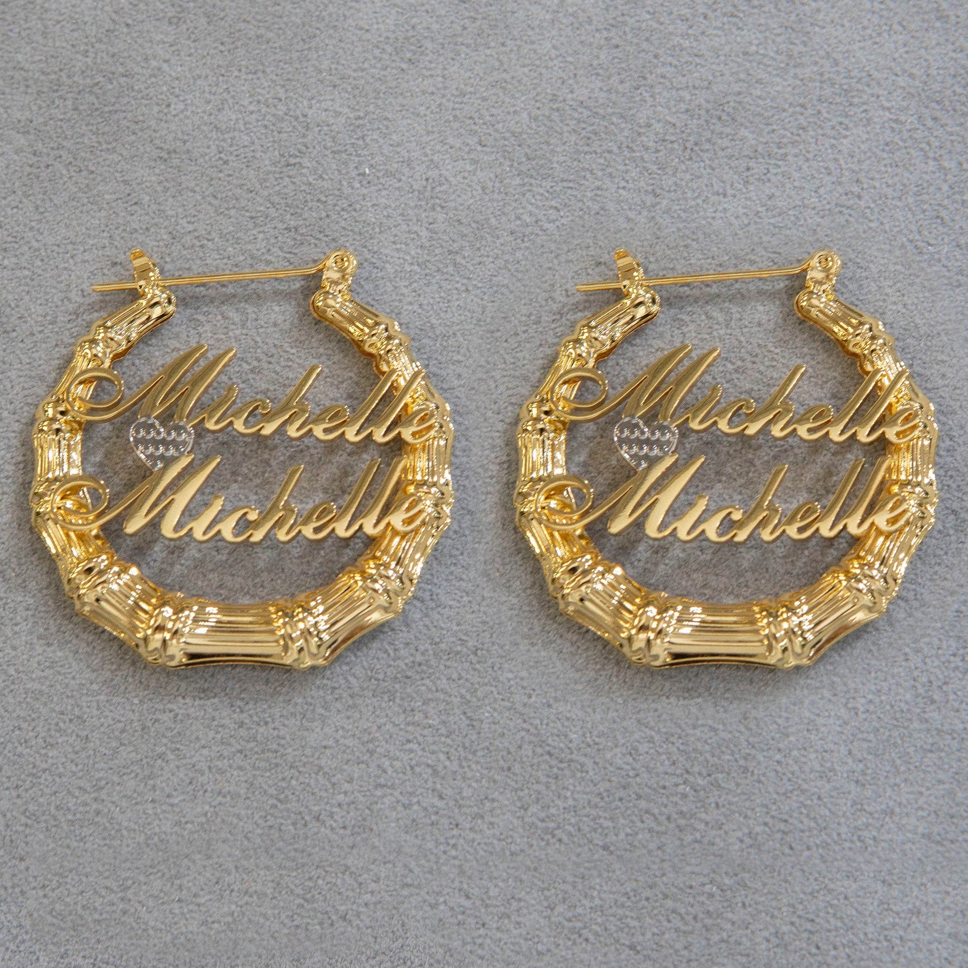 14K Gold Plated Ladies Script Name Plate Hoop Earrings. The diameter of the hoop earring is 1.6 inches. Due to the custom nature of this product, please allow 14-21 business days for completion.