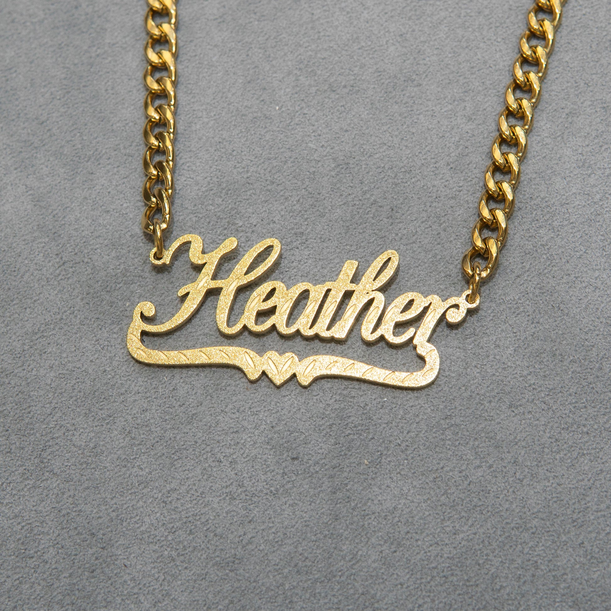 14K Gold Plated Ladies Script Name Plate Necklace. The pendant measures 1.8 inches wide and 0.8 inches long. The width of the chain Is 5mm. Personalize it with your name and choose the perfect length for the included Cuban chain which can be selected above. Due to the custom nature of this product, please allow 14-21 business days for completion.
