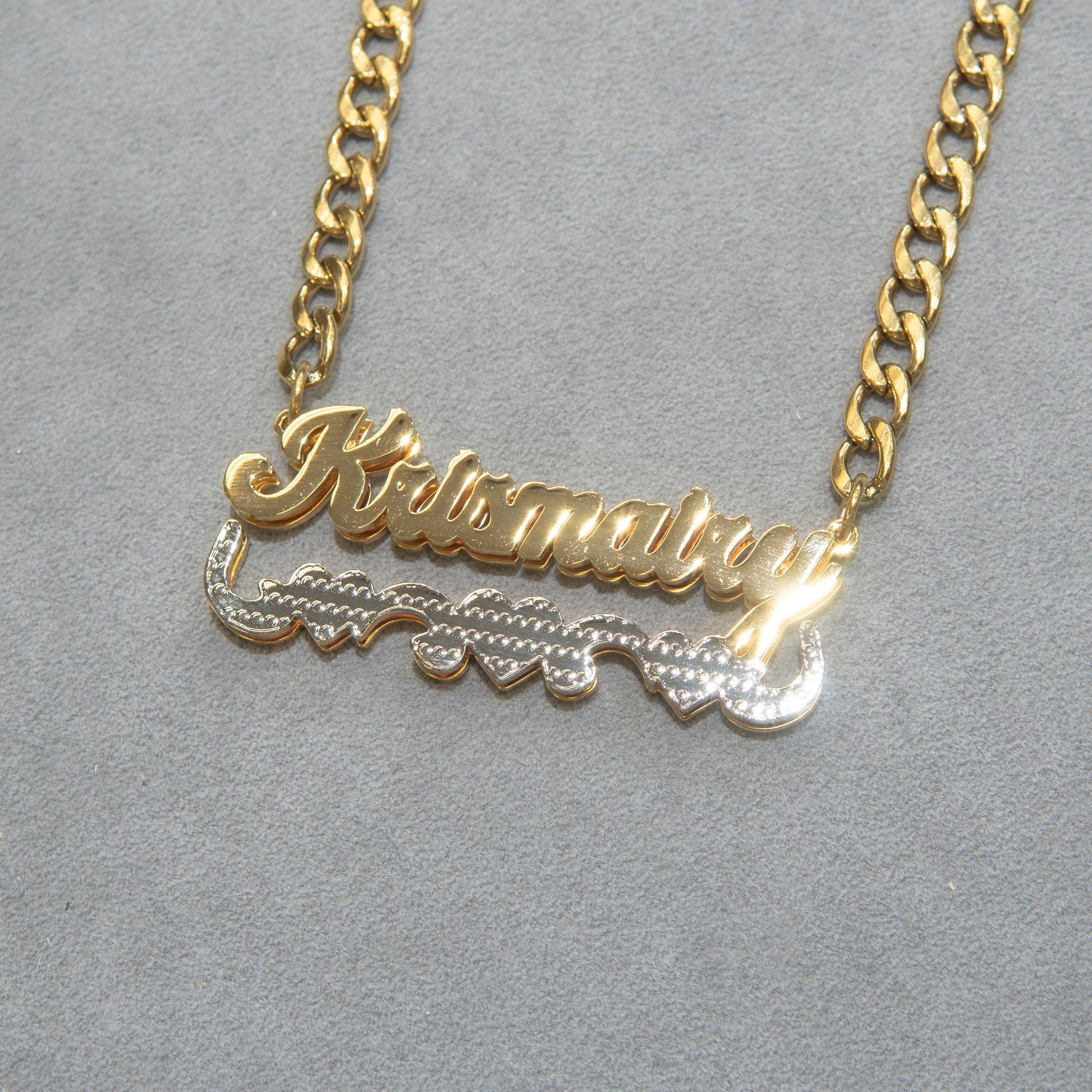 14K Gold Plated Ladies Script Name Plate Necklace. The pendant measures 2 inches wide and 0.8 inches long. The width of the chain Is 5mm. Personalize it with your name and choose the perfect length for the included Cuban chain which can be selected above. Due to the custom nature of this product, please allow 14-21 business days for completion.