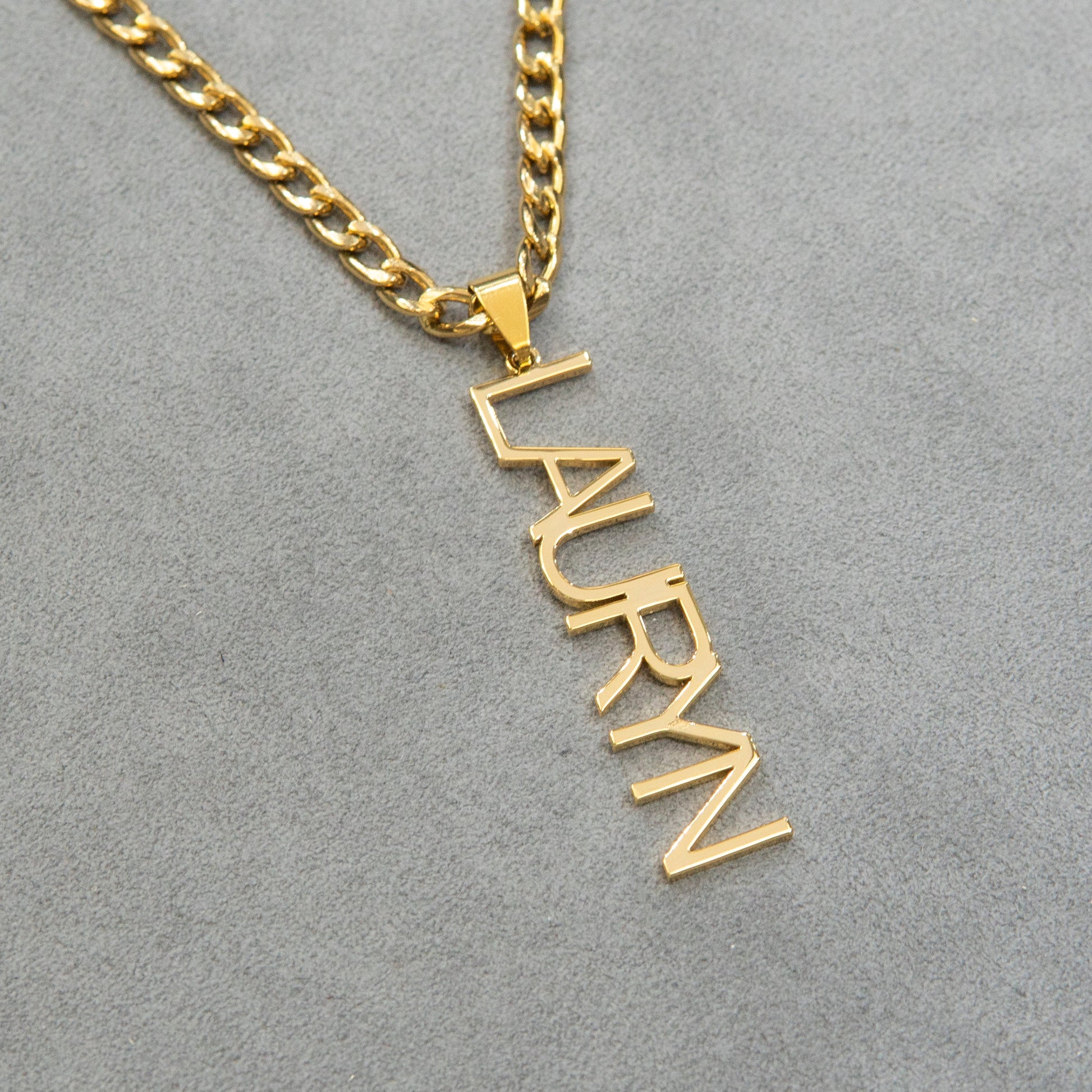 14K Gold Plated Ladies Script Name Plate Necklace. The pendant measures 0.5 inches wide and 2.4 inches long. The width of the chain Is 5mm. Personalize it with your name and choose the perfect length for the included Cuban chain which can be selected above. Due to the custom nature of this product, please allow 14-21 business days for completion.