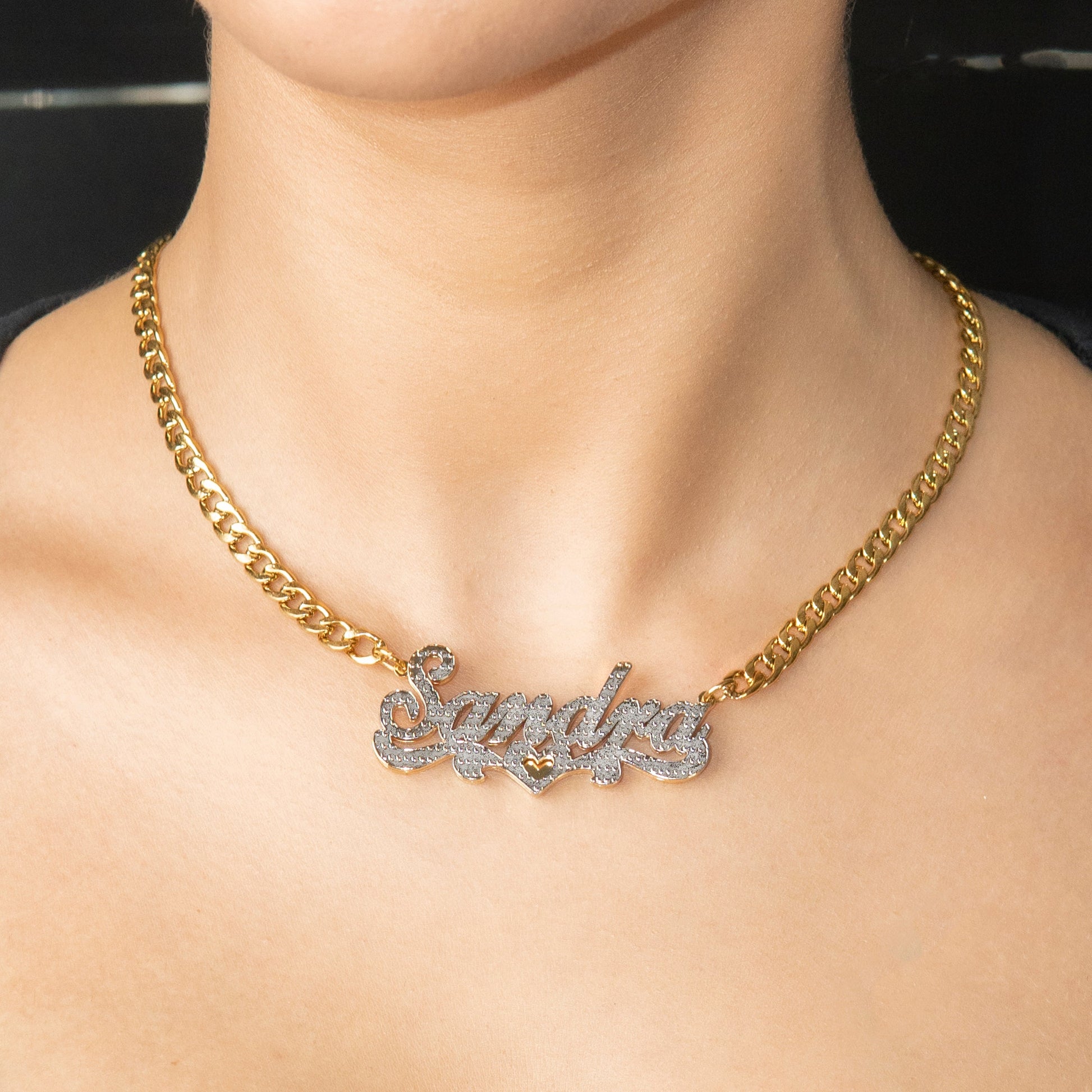 14K Gold Plated Ladies Script Name Plate Necklace. The pendant measures 1.9 inches wide and 0.9 inches long. The width of the chain Is 5mm. Personalize it with your name and choose the perfect length for the included Cuban chain which can be selected above. Due to the custom nature of this product, please allow 14-21 business days for completion.