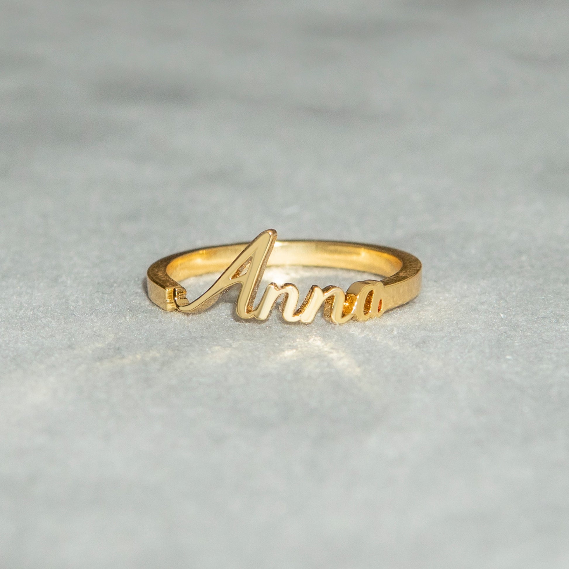 14K Gold Plated Ladies Script Name Plate Ring. The ring measures 0.25 inches wide and 0.6 inches long. Due to the custom nature of this product, please allow 14-21 business days for completion.